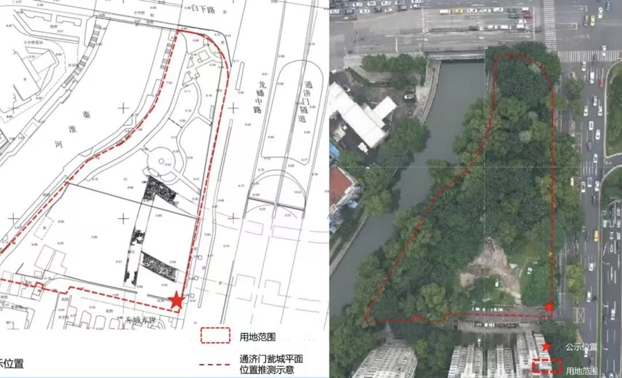 通济门是南京明城墙13门中规模最大的,在上世纪五六十年代被拆除。2016年,在考古中发现了通济门瓮城西北角遗址。去年,市规划资源局对秦淮老城单元NJZCa030-32规划管理单元图则进行修改公示,提出通济门城墙遗址拟采用露天保护与展示方式。