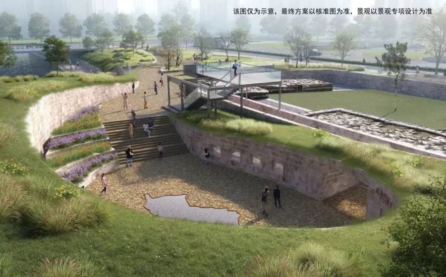 根据公示方案,项目建设内容包括遗址展示、配套服务及绿地游园,地下计容建筑面积为775平方米,容积率为0.12,绿地率为38%。从效果图上看,整个场地西南侧将设有下沉式广场,广场上方搭建简易钢架支撑玻璃护栏空中展台,下设配套服务室,屋顶覆土与地形完美融合。面向龙蟠中路一侧展示遗址探方,让市民探索明城墙文化;面向内秦淮河一侧设置沿河台阶,让市民可亲近水岸。